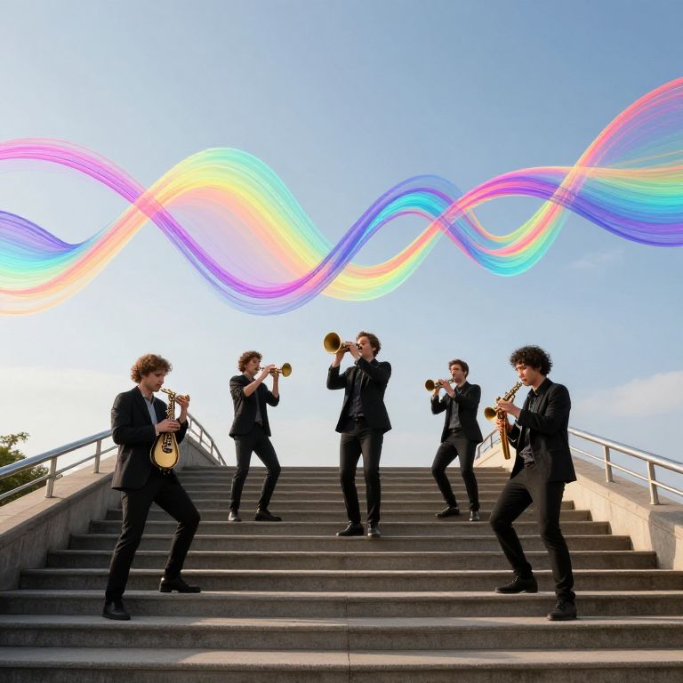 On a bridge of stairs, musicians play gravity-defying instruments that create sound in visible, rainbow-colored waves that float and drift.