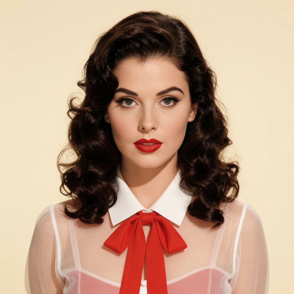 The image depicts a highly detailed and realistic portrait of a woman with a symmetrical and curvaceous figure. Her hair is styled in voluminous, wavy curls that frame her face, cascading down in soft, flowing waves. She is wearing a transparent blouse with a white collar and a red bow at the neckline, which adds a touch of elegance and femininity to her appearance. The blouse is open at the shoulders, revealing a delicate and graceful neckline. The woman's lips are painted with a vibrant red lipstick, complementing her fair skin and enhancing her overall beauty. Her eyes are large and expressive, with detailed shading and highlights that give them a lifelike appearance. The background is a soft, warm beige, which contrasts beautifully with the woman's dark hair and the red accents of her blouse. The lighting in the image is bright and natural, suggesting that it is taken during daylight hours. The overall composition is balanced and harmonious, with the woman's face and upper body centered in the frame, creating a sense of symmetry and stability. The lines in the image are clearly drawn, adding to the realism and detail of the portrait. The style of the portrait is reminiscent of the classic pin-up art of the mid-20th century, with its emphasis on beauty, femininity, and elegance.