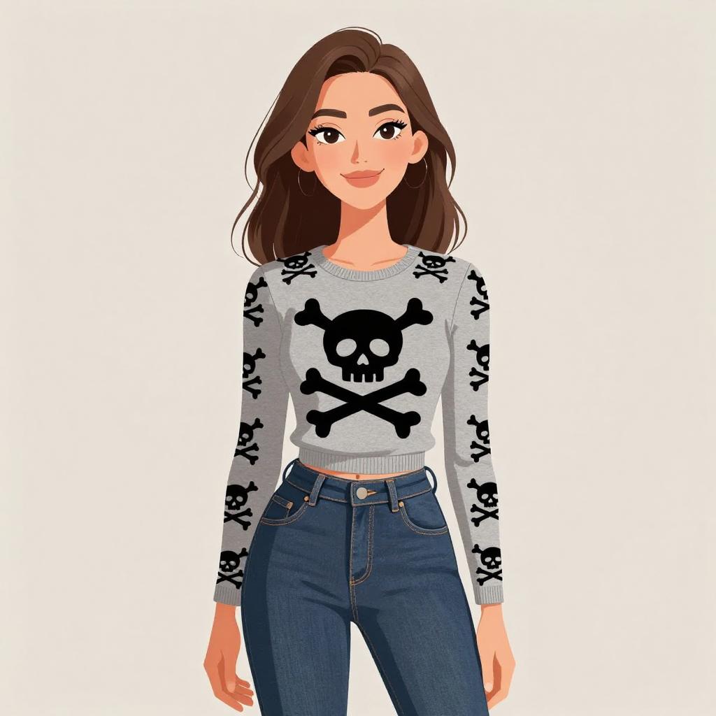 Woman with pretty face and pretty hair. smiling Woman, casual, long-sleeved printed top in light gray, black quirky skull and crossbones pattern, crew neckline, ribbed texture, fitted cuffs, tucked into medium-wash skinny jeans, mid-rise waist. --sref 1467