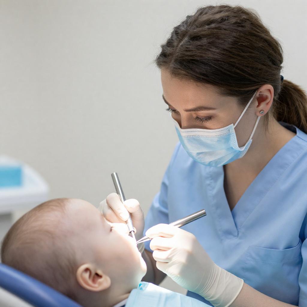 Photograph of a female dentist with brown hair, wearing a blue top and white mask, administering a treatment to a bald infant. The dentist looks focused, with the infant's head in the foreground, showing the infant's small ears. Bright background.