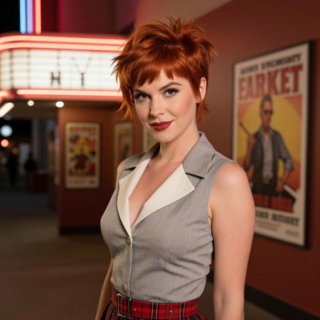 A bold redhead with a short, messy undercut hairstyle poses in a retro 1940s-style Hollywood costume, standing in a vintage movie theater lobby with vintage posters and dimly lit neon signs, her face sharp and expressive with a confident smirk.