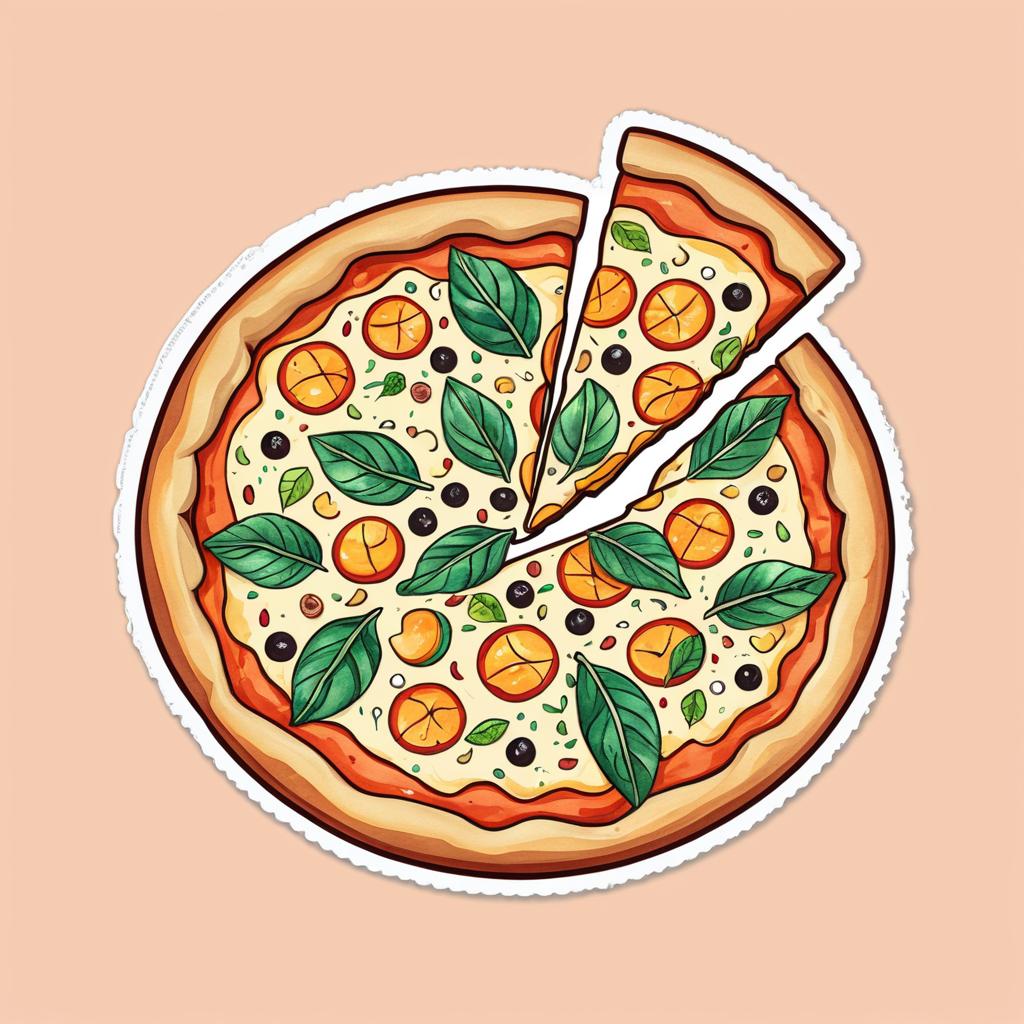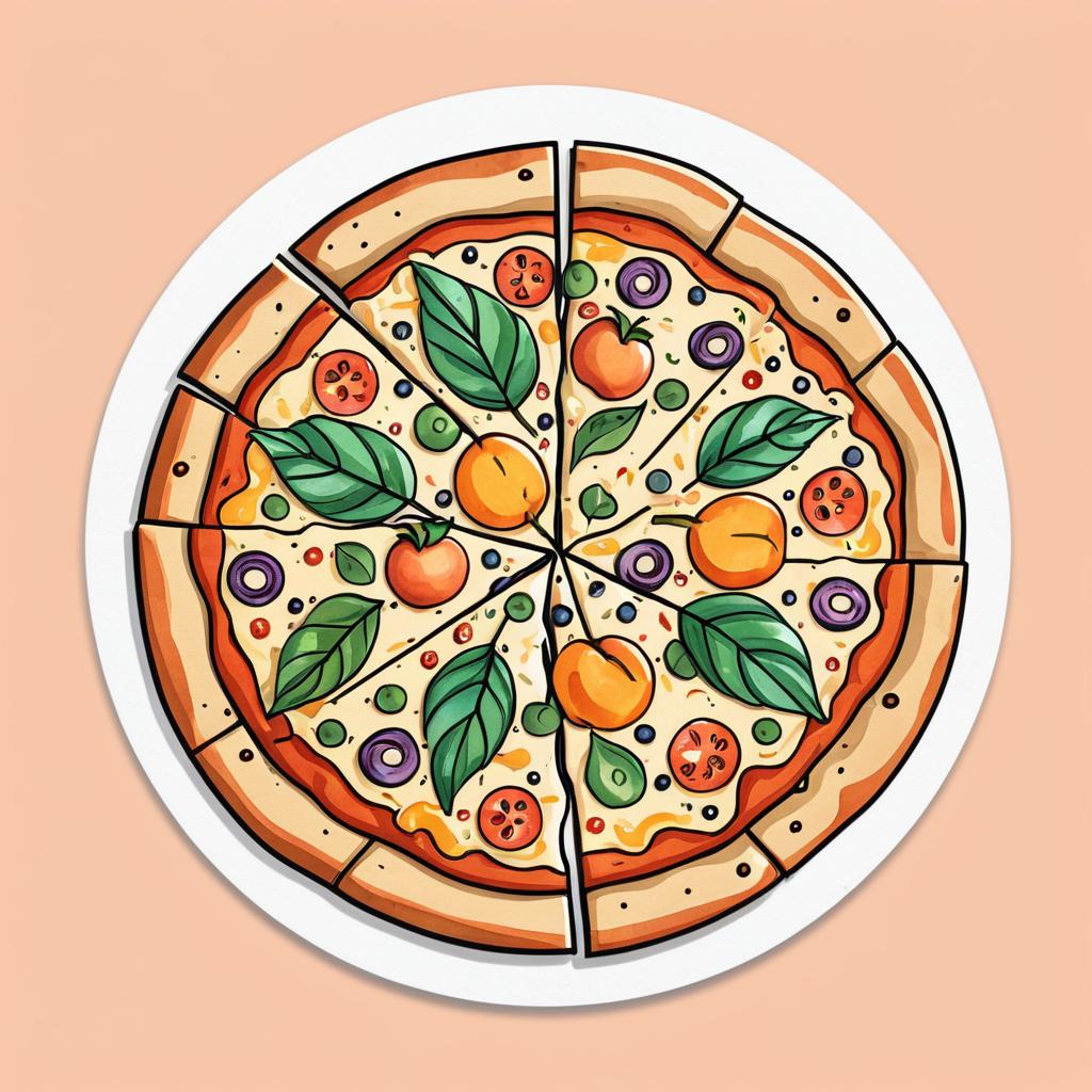 STICKER, solid peach background, SHARP FOCUS of A Detailed watercolor cute whole pizza, Leaf Swirls, Rainbow Colors, Redbubble Sticker, Splash In Vibrant Colors, 3D Vector Art, Cute And Quirky, Adobe Illustrator, HandDrawn, Digital Painting, LowPoly, Soft Lighting, Bird'sEye View, Isometric Style, Retro Aesthetic, Focused On The Character, 4K Resolution