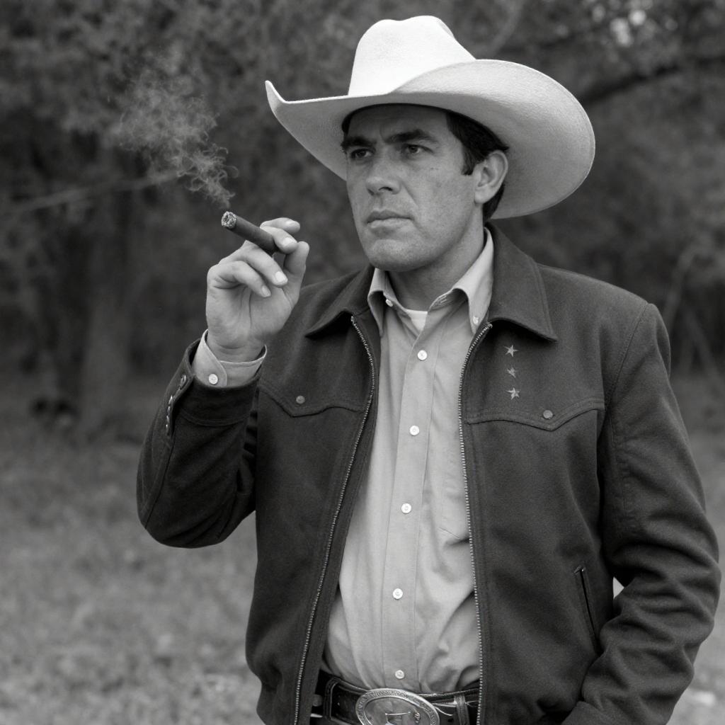 Black-and-white photograph of a man in a cowboy hat, dark jacket with stars, light shirt, and belt. He holds a cigar in his right hand, standing in a wooded area. Intense facial expression. Foreground: his right hand. Background: trees and foliage.
