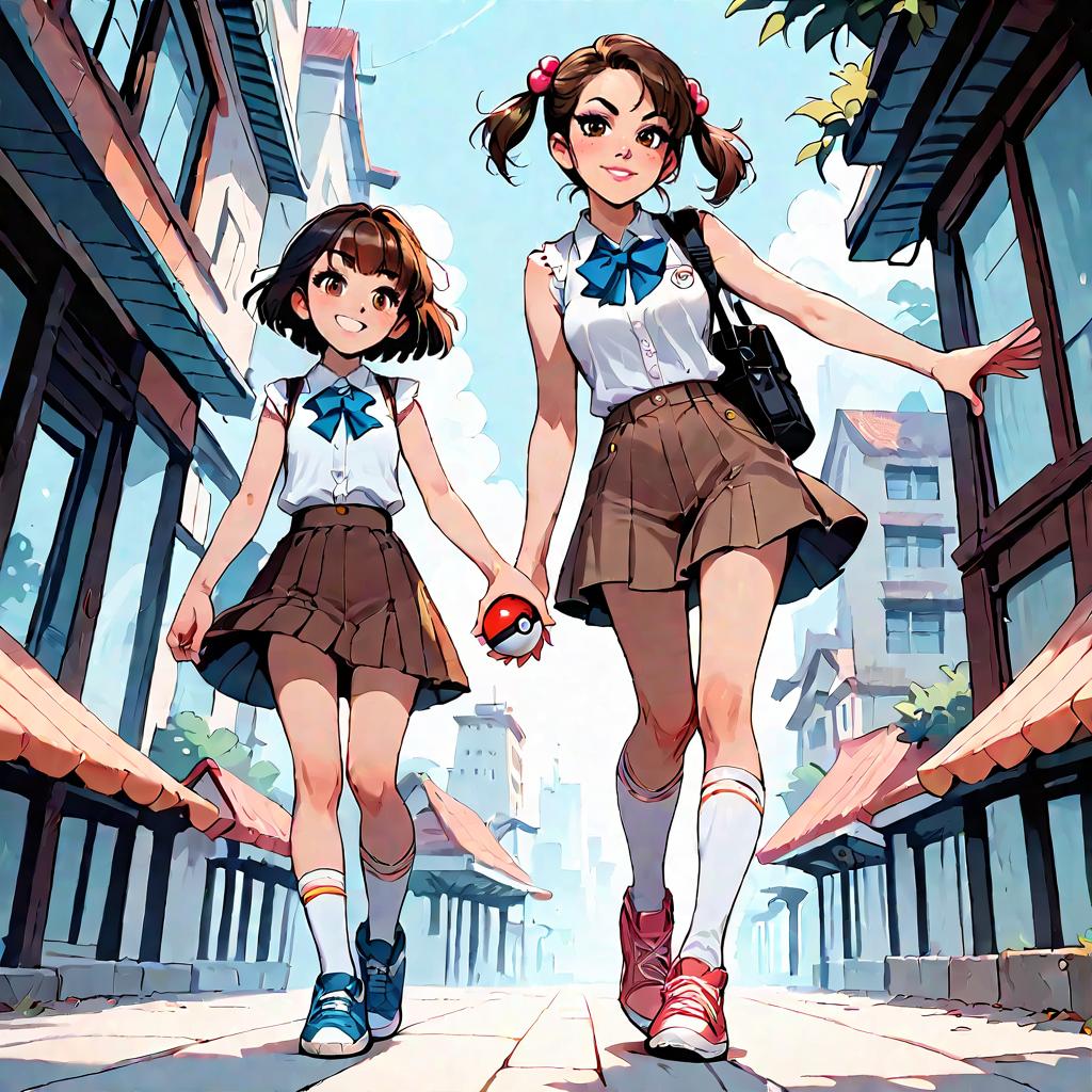Digital anime-style illustration of two school-age girls walking hand in hand in an urban setting. Both wear sleeveless white shirts with blue bows, brown skirts, and knee-high socks paired with sneakers. The girl on the right has brown hair tied in pigtails with pink hair bobbles and carries a black shoulder bag, while the girl on the left has short dark brown bobbed hair. The girl on the right is holding a red and white Pokeball. The background shows a city street with buildings and a clear blue sky.