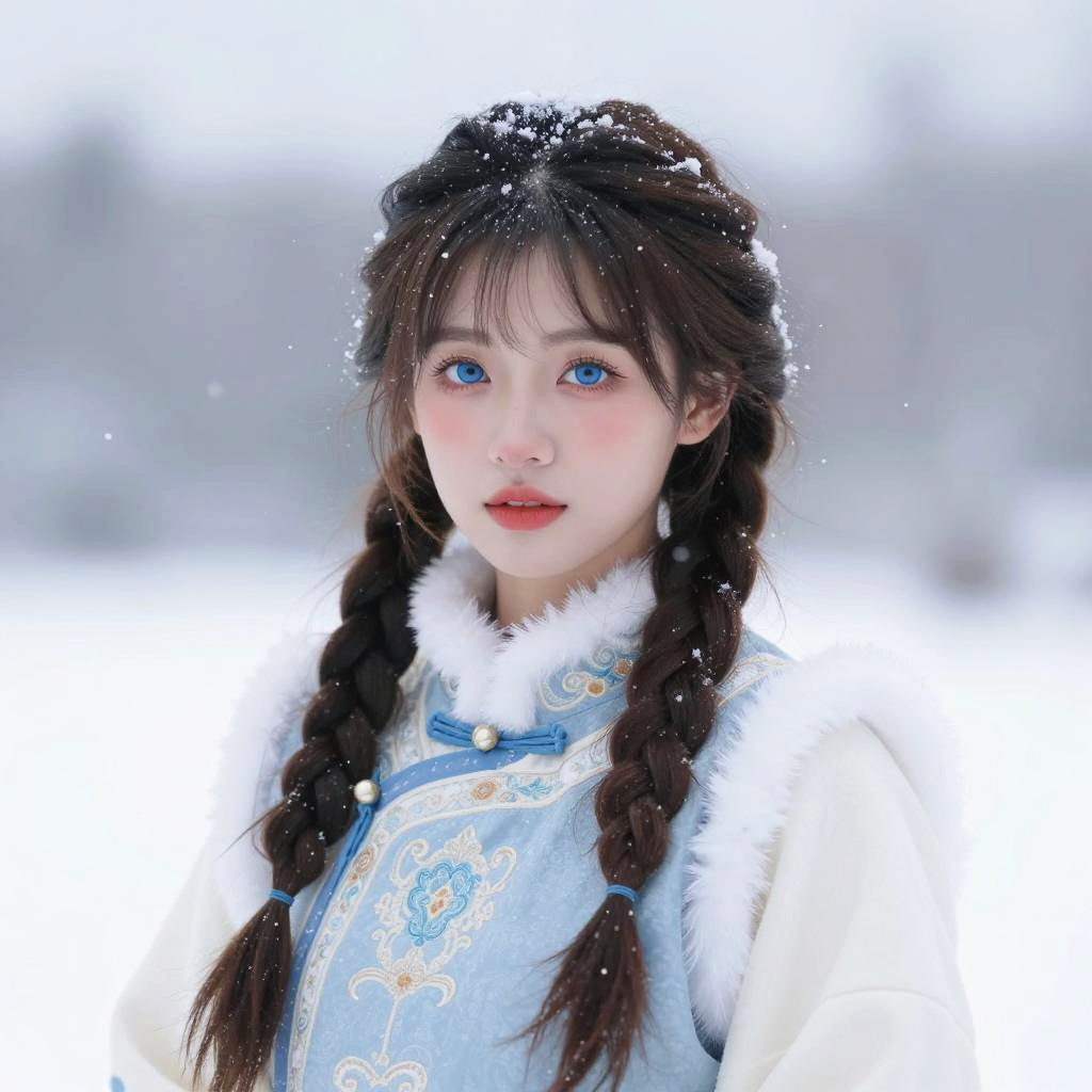 A young woman with long silver hair and a light-colored coat holds a glowing lantern in a snow-covered village square. Snow dusts the rooftops and falls gently through the air as warm red lanterns illuminate the traditional houses in the background. The serene winter scene features cool light highlights and a magical ambiance.