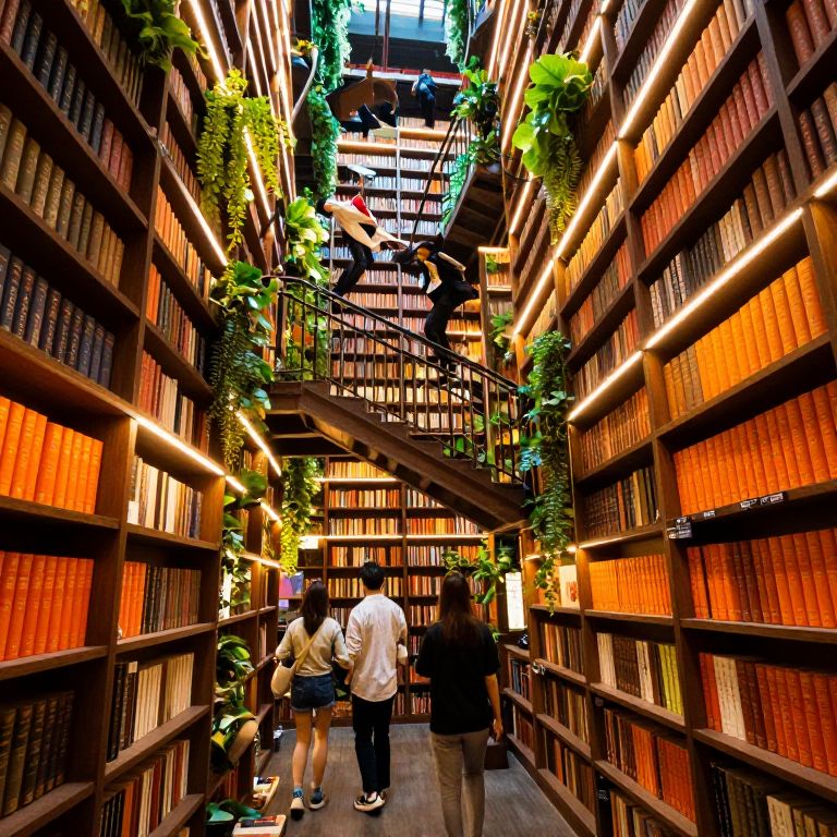 Enchanted alleyway illuminated by warm lights, lined with towering bookshelves filled with vibrant orange spines, where three individuals walk below while others float gracefully between levels, defying gravity amidst lush greenery and cascading staircases.