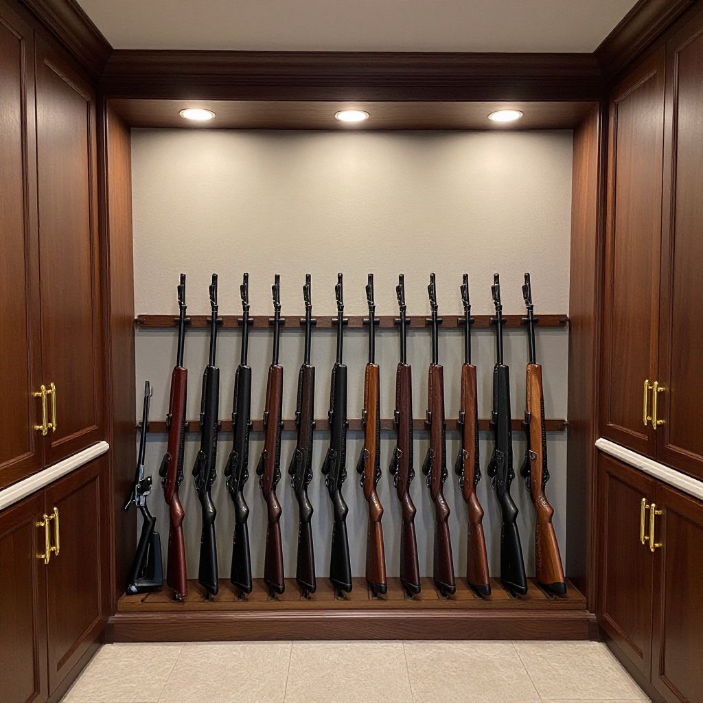 Elegantly designed gun room featuring a symmetrical arrangement of twenty-four rifles displayed on wooden racks, flanked by custom-built cabinetry with polished brass handles and recessed lighting above, creating a sophisticated and secure storage space.