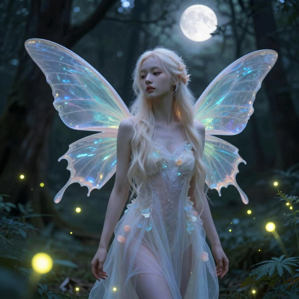 Pale skintones ethereal fairy with translucent wings, surrounded by glowing fireflies in a moonlit forest, soft pastel colors, dreamy atmosphere, fantasy art