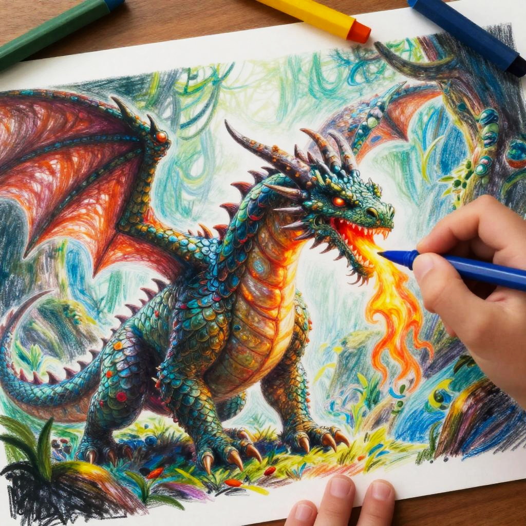 Drawing to photo AI technology turning a child's crayon drawing of a fantasy dragon into a lifelike, highly detailed photo showing scales, fiery breath, and mystical forest background in vibrant colors.