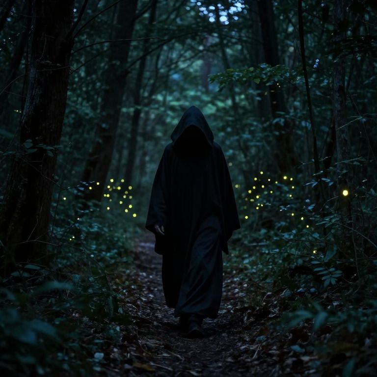 A photograph depicts a mysterious figure in a dark, hooded cloak walking down a forest path at dusk. The figure's face is obscured by the hood, creating an eerie, enigmatic presence. Surrounding the path are tall trees with dense foliage, and glowing fireflies illuminate the dark, blue-tinted forest. The path is covered in fallen leaves and the fireflies' soft light contrasts with the deep shadows. The image evokes a sense of mystery and enchantment, with the fireflies adding a magical element to the dark, wooded environment. The overall tone is moody and atmospheric.