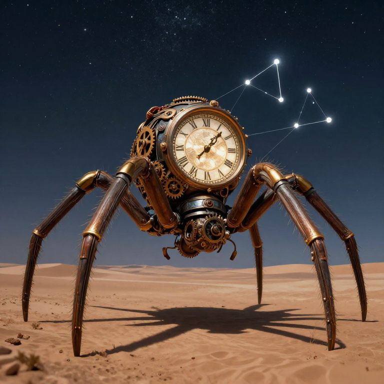 A colossal, steampunk-inspired clockwork spider, adorned with intricate gears and golden accents, stands majestically against a starry night sky, its body crowned by a large, illuminated clock face that seems to weave constellations from threads of moonlight, casting a surreal shadow over an endless desert landscape.