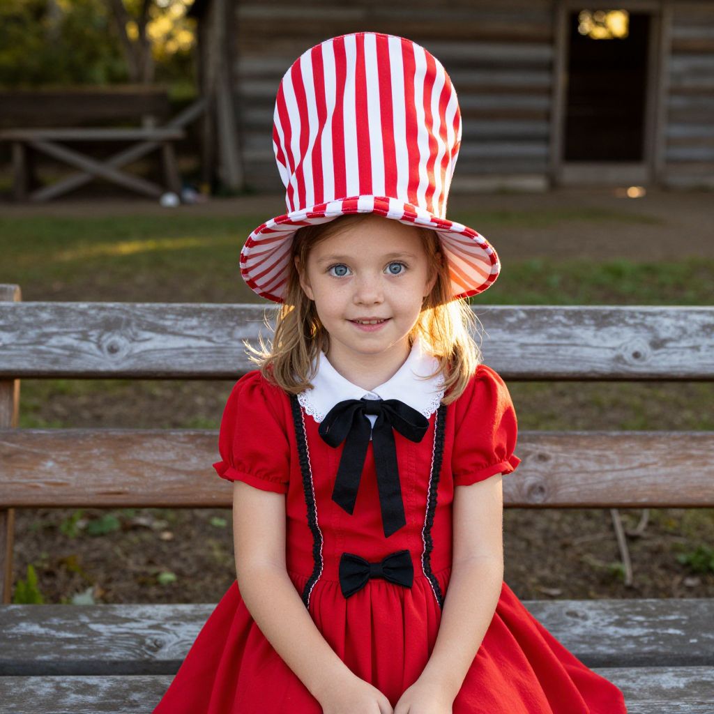Photograph of a young girl with blue eyes, wearing a red dress, black bow, and striped top hat, sitting on a wooden bench in front
