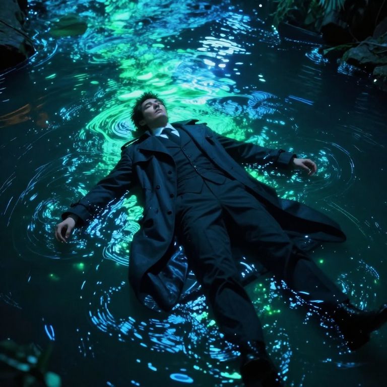 Photograph-like digital art of a young man with fair skin and dark brown hair, lying in a dark, reflective pond. He's dressed in a crisp, white suit with a white shirt and white shoes. The background features a lush, jungle-like setting with glowing, neon-colored lights in various shapes and colors, including purple, blue, and green. Ferns and large tropical plants surround the pond, with a lit lantern on the right. The man's expression is calm, and his body is relaxed, floating on the water's surface. The scene has a surreal, fantasy-like atmosphere.