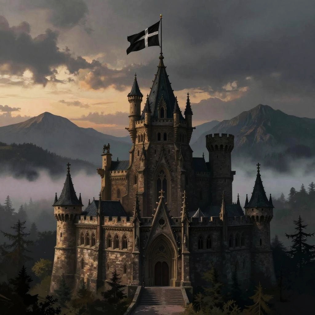 Black cross flag flying over a gothic castle at dusk, moody lighting, misty mountains in the distance, dramatic and mysterious vibe, digital painting with intricate details