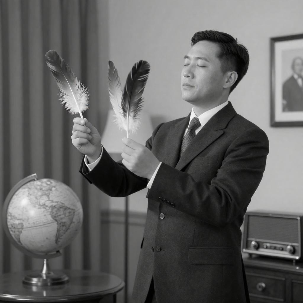 Black-and-white photograph of a man in a suit standing in front of a large, illuminated rectangular screen. Industrial warehouse background with dark shadows and exposed beams. Man has short hair, neutral expression, hands at sides. Screen is brightest area, center. Concrete floor, scattered shadows.