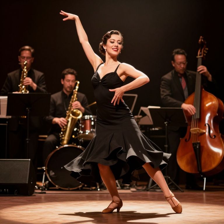 A spirited big band dancer in a high-silhouette swing dress, standing at the center of a dimly lit live show stage with a jazz band behind her, eyes locked in enthusiasm, radiant and full of energy, with soft shadows and warm ambient lighting, capturing the joy of swing dance culture
