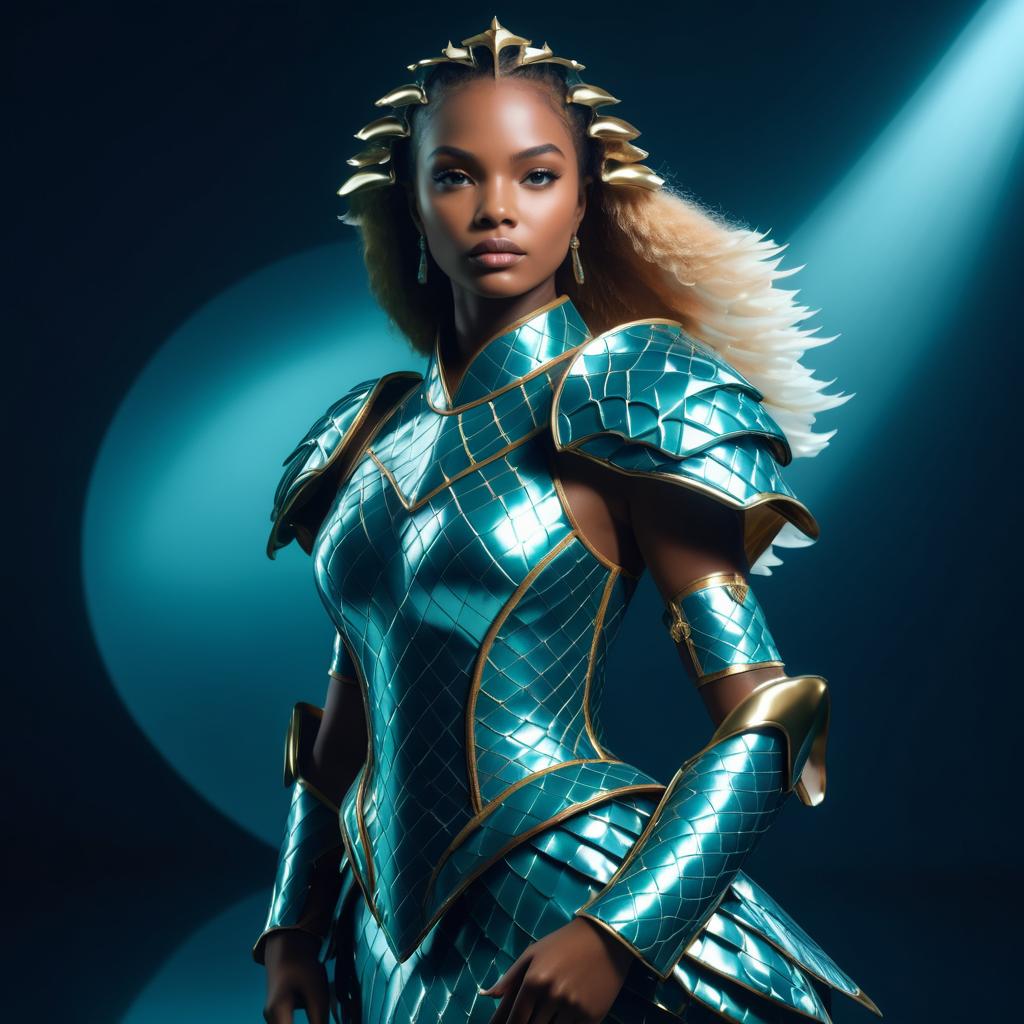 Portrait of a graceful Black mermaid model wearing intricately designed Fendi-inspired armor made of luxurious turquoise and gold materials. The armor features scale-like patterns and includes shoulder plates, arm guards, and a fitted bodice. The model has long blonde hair adorned with golden seashell-like accessories, set against a dark, cinematic studio background with dramatic professional lighting highlighting the details and textures.