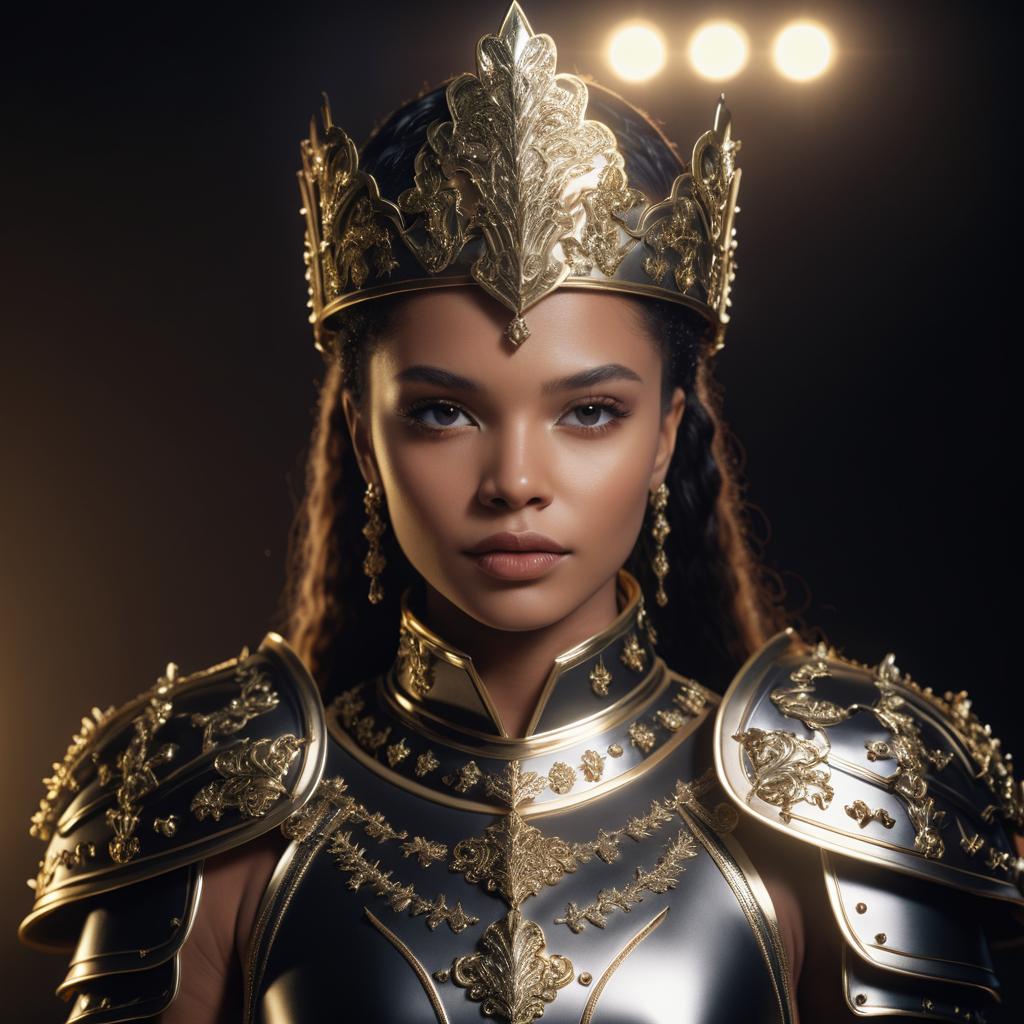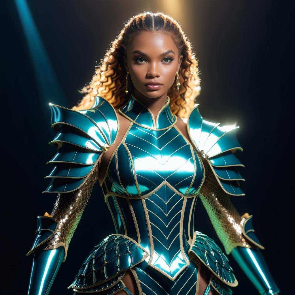 A graceful mermaid model wearing Fendi armor, luxury materials, cinematic and professional studio lighting, sharp focus, 4K.