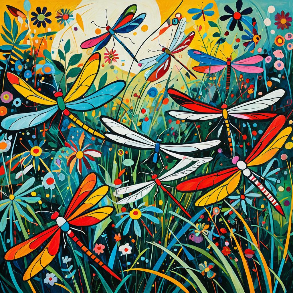 A vibrant and energetic abstract painting of a garden filled with colorful dragonflies and flowers. The artwork features chaotic brushstrokes and whimsical shapes in a cubist and Kandinsky-inspired style, using vivid tones and expressive forms to create a lively and surreal nature scene.