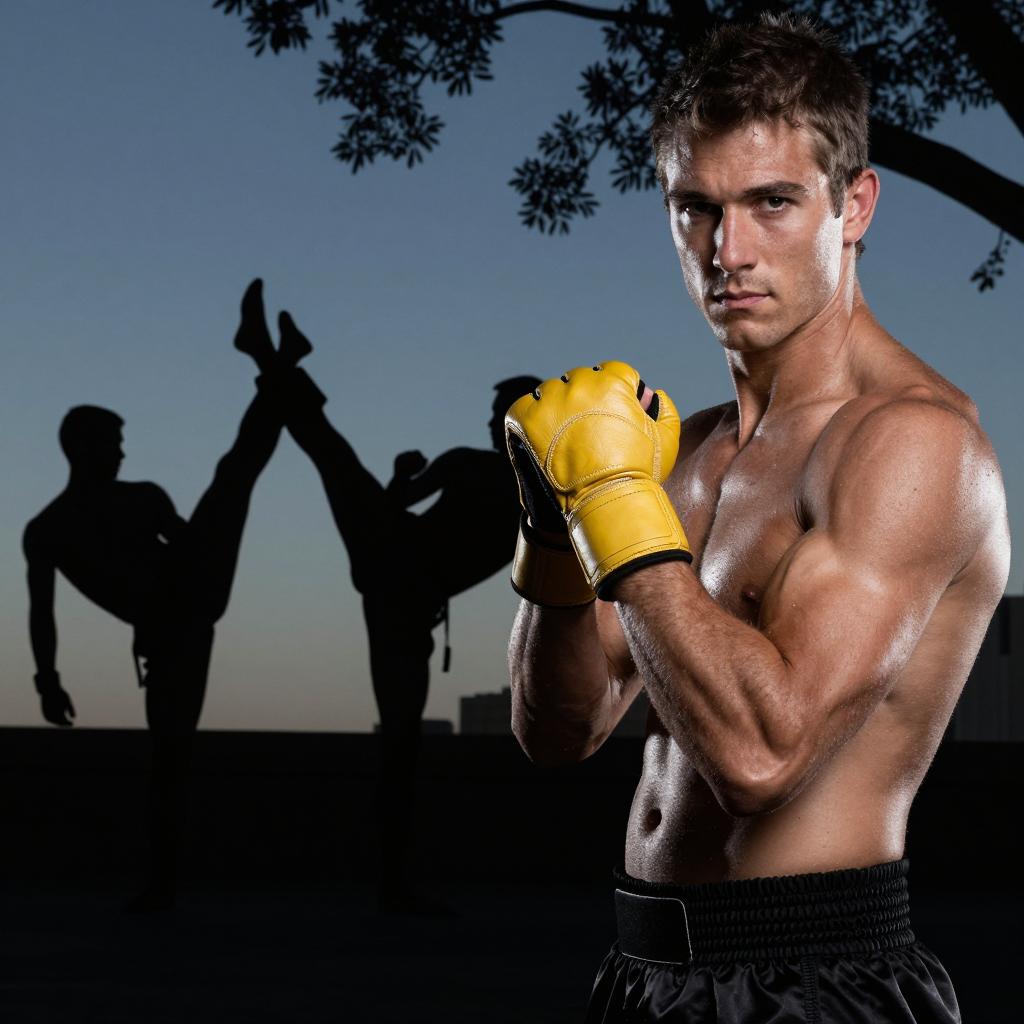Muscular shirtless man with tan skin, short brown hair, and intense expression stands right, wearing yellow-gloved hands. Silhouetted martial artists perform high kicks in dark background. Blue gradient sky with tree branches and faint building outline. Man's left arm crosses over chest, right arm rests on top. Two silhouetted figures on left.