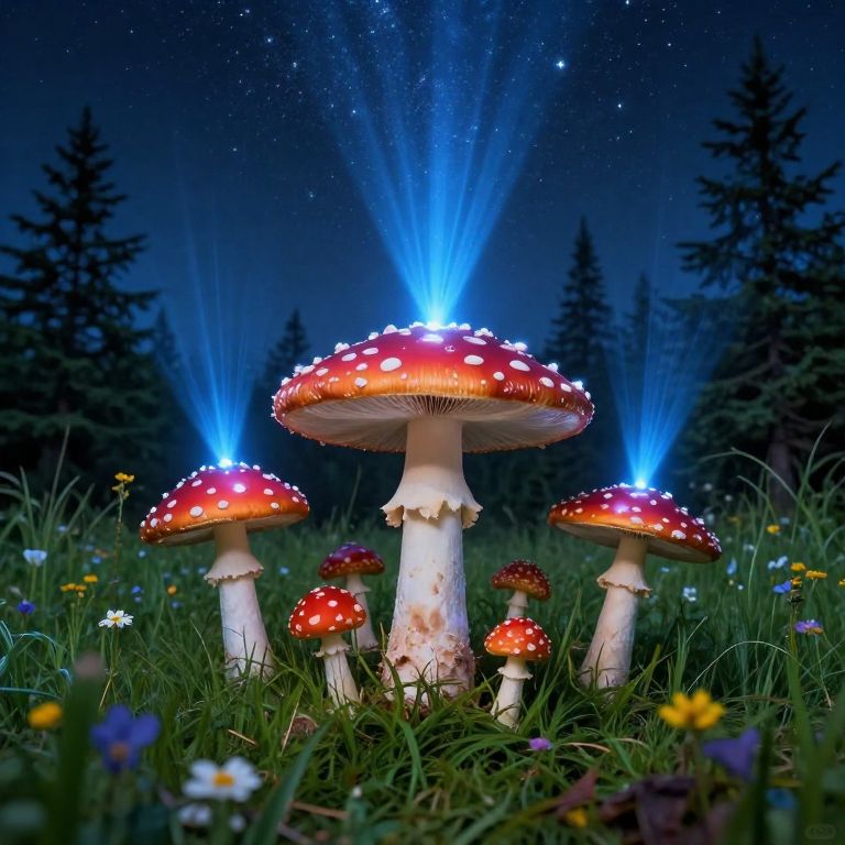 Surreal meadow glows under a starlit sky as gravity-defying mushrooms with vibrant red caps and white stems sprout upward, their tops adorned with sparkling white spots and emitting radiant blue beams that cascade into the cosmos, surrounded by lush green grass, scattered wildflowers, and towering evergreen trees.