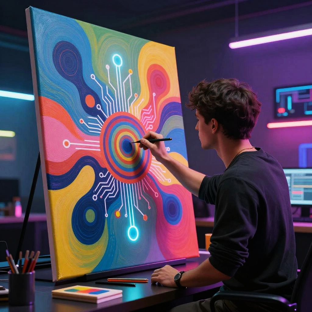 Art ais concept featuring a futuristic AI artist painting dynamic digital canvases in a neon-lit studio, blending abstract shapes and vibrant colors with glowing circuitry patterns, cyberpunk atmosphere, ultra-detailed, 4k resolution