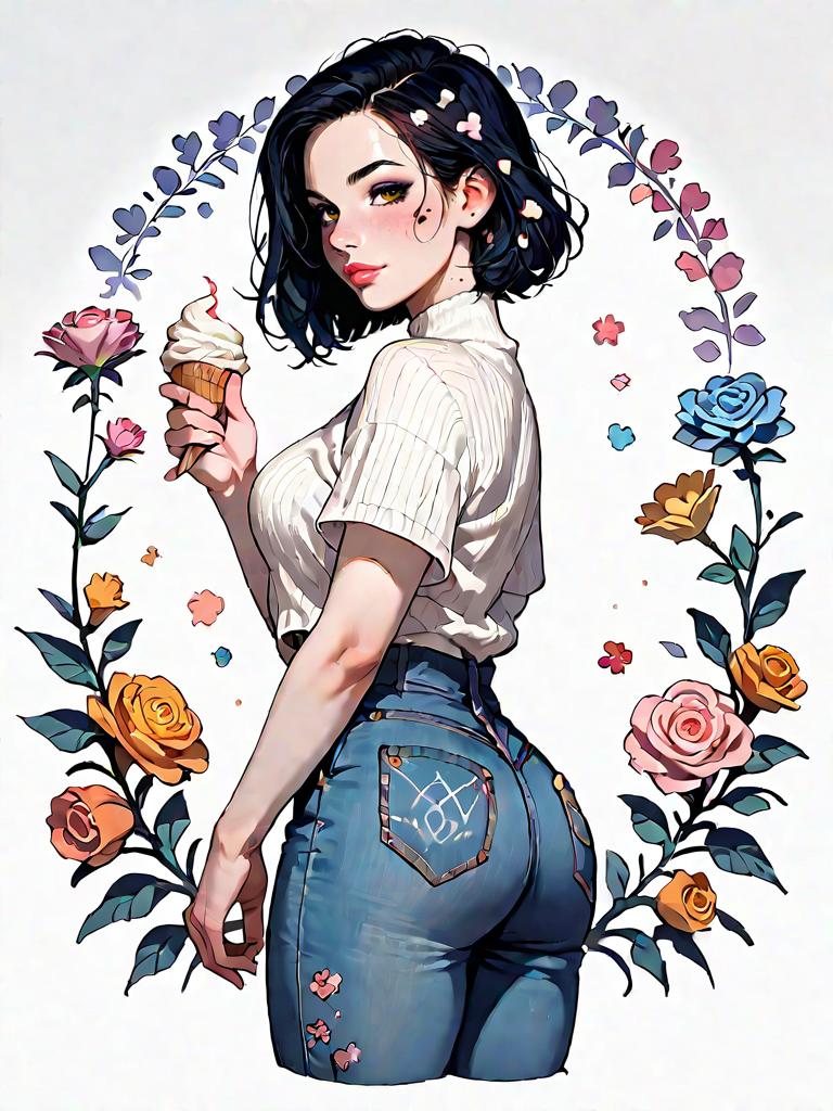 1girl, source_comics, realistic face, full body shot, Woman, casual style, cropped knit sweater in cream with open weave patterns, short sleeves, high-waisted black denim jeans, solid color, neutral studio background.