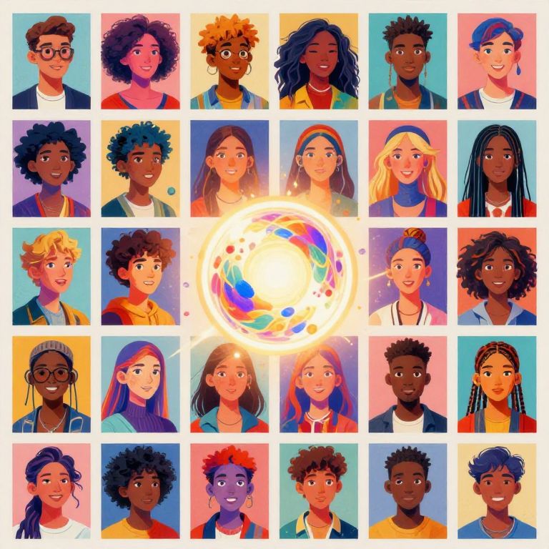 Character design prompt generator artistic concept, a vibrant collage of character thumbnails in multiple art styles arranged around a glowing central orb symbolizing creativity flow, diverse ethnicities and expressions, colorful brush strokes, dynamic composition