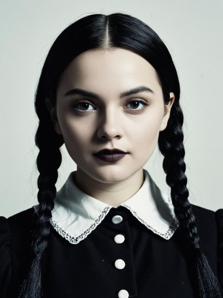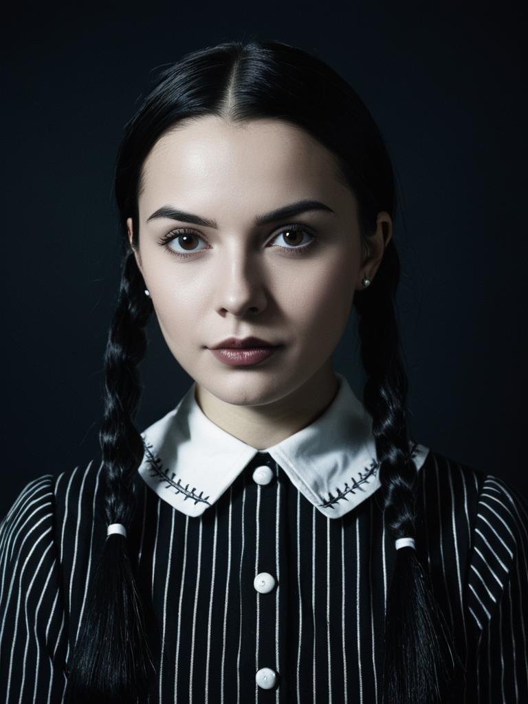Photorealistic studio portrait of a young woman dressed in a classic Wednesday Addams costume featuring a black dress with white collar, long braided hair, and a neutral expression. The dark, moody background enhances the gothic style of the outfit.