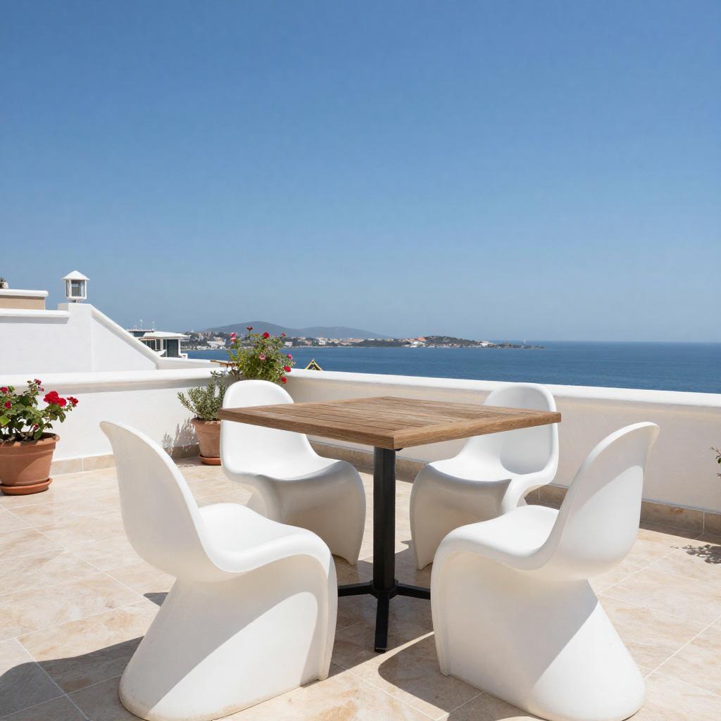 Photograph of a sunlit scene with a shallow depth of field. In the foreground, a large, textured, orange clay pipe lies horizontally, its ridged surface catching the light. Behind it, slightly blurred, is a small, weathered wooden boat with visible cracks, resting on a white, sunbaked surface. The bright blue water and white structures in the background are softly focused, creating a serene, coastal atmosphere. The camera angle is slightly low, emphasizing the pipe's texture.