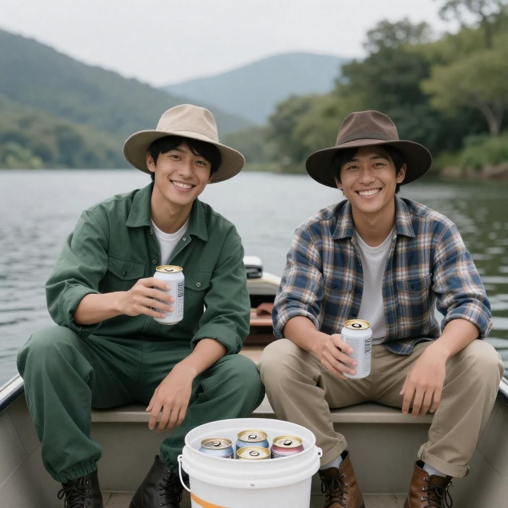 Photograph of two men in a boat on a lake. One in green outfit and beige hat, smiling, holds a can. The other in plaid shirt and brown hat, grinning, holds a can. Mountains and trees in the background. Boat has a white bucket with cans. Both men have casual, relaxed poses.