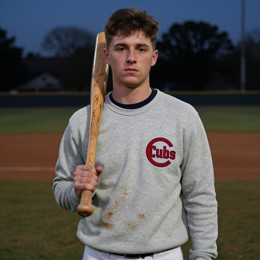 A young adult male, around 28 years old, with rugged facial features, short brown hair, and a neutral expression, wearing a classic vintage baseball sweatshirt with the logo 'Cubs' on the front, standing in a dimly lit community baseball field at dusk, holding a worn wooden bat, the sweatshirt slightly wrinkled from use, with subtle dirt and grass stains on the sleeves.