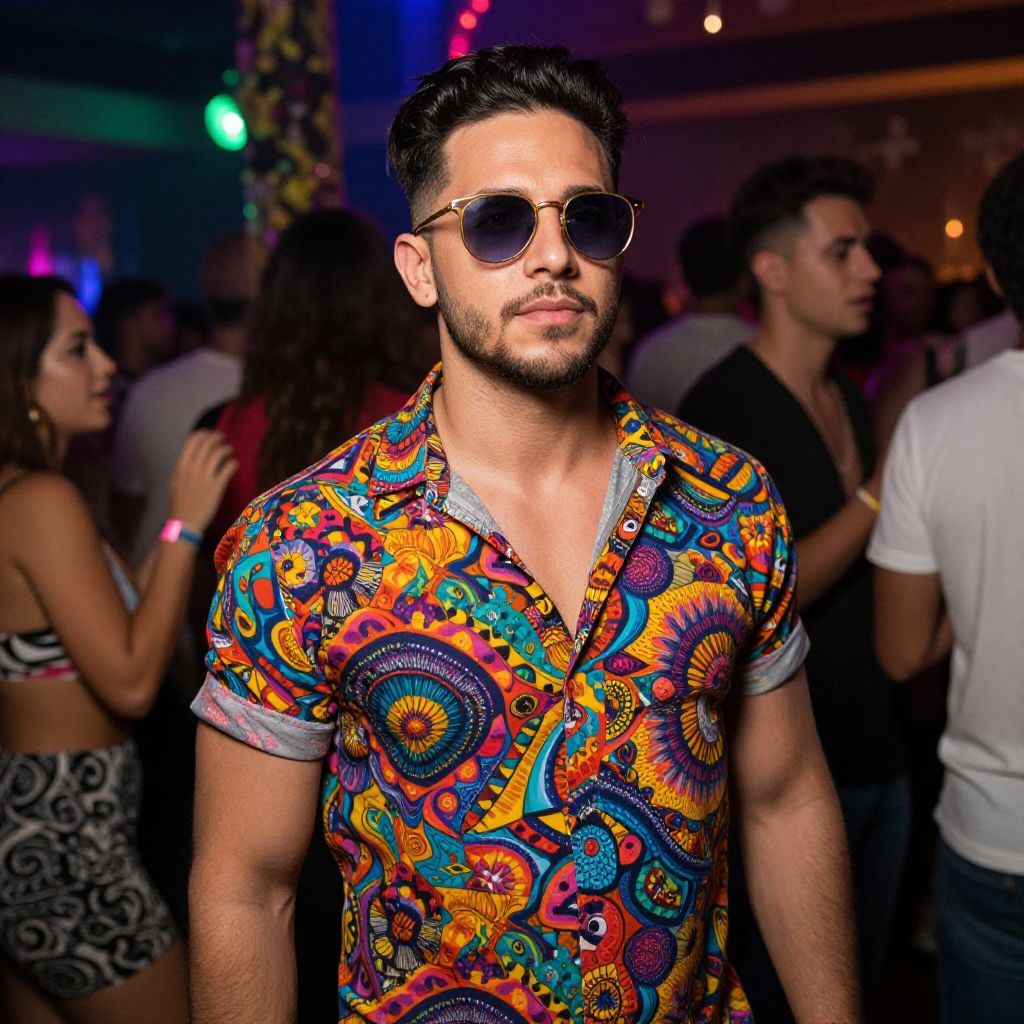 A man wearing a vibrant, psychedelic patterned shirt and stylish sunglasses stands amidst a lively party atmosphere, with colorful lights and festive decor adding to the energetic scene.