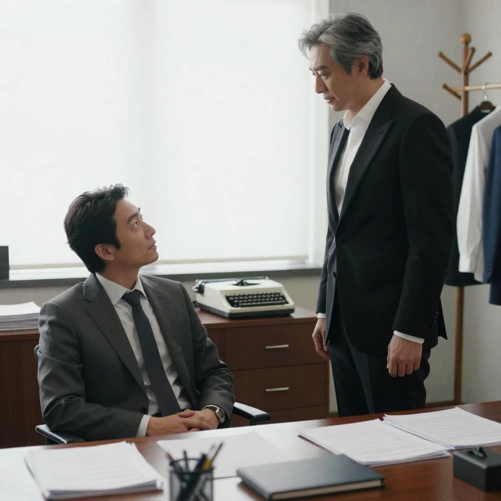 Photograph of two men in an office. Seated man in gray suit, dark hair, hands clasped, looking at standing man. Standing man in black tuxedo, white shirt, gray hair, hands slightly raised, facing seated man. Desk with papers, typewriter, drawers, window behind them. Coat hangers with clothes on the right.