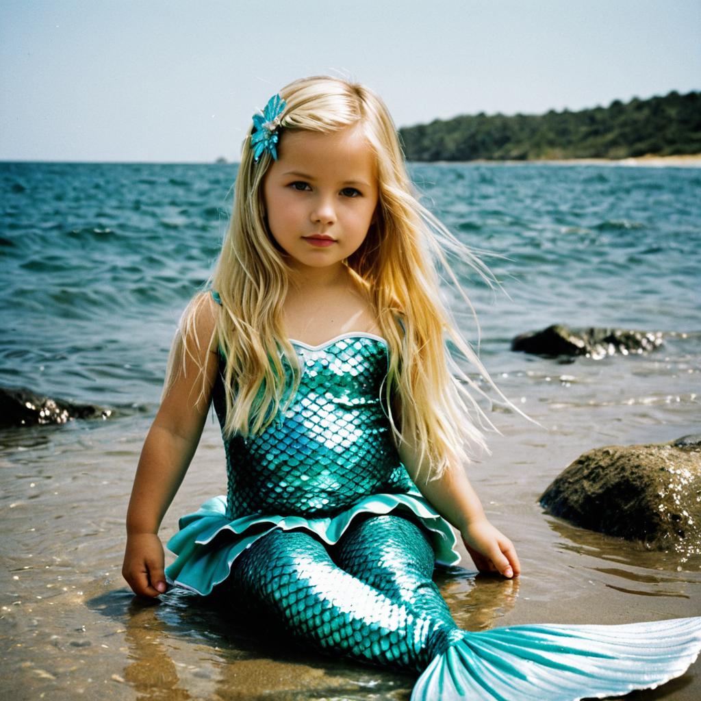 Portrait of a young girl with long blonde hair and blue eyes wearing a shiny green mermaid outfit with scale patterns. She is sitting against a dark background, adorned with a decorative crown made of seashells and flowers. Surrounding her are white and yellow plumeria flowers and large seashells, enhancing the oceanic theme.