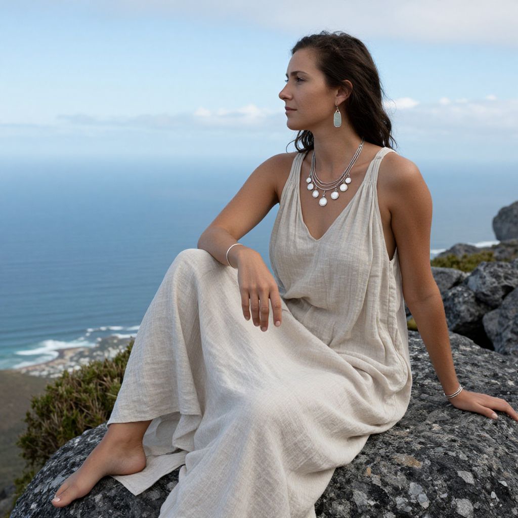 Woman sitting gracefully at the base of Table Mountain, wearing a flowing slow-fashion linen dress and eco-friendly, ethical silver jewelry, her gaze directed towards the vast ocean beyond.