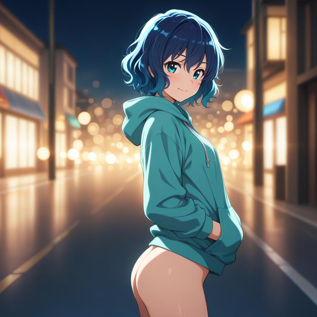 Masterpiece, best quality, 1girl, anime screencap, short hair, blue hair, green eyes, wavy hair, from side, looking at viewer, smile, hoodie, bottomless, depth of field, bokeh, street, night