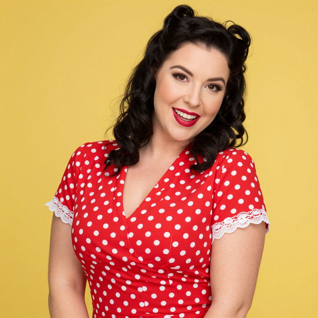 Photograph of a curvy woman with fair skin and dark, wavy hair styled in vintage curls. She's wearing a bright red, short-sleeved polka dot dress with white lace trim on the sleeves, and bold red lipstick. She's smiling at the camera with a slightly tilted head, set against a solid yellow background. Her confident, retro look exudes a classic, pin-up vibe.