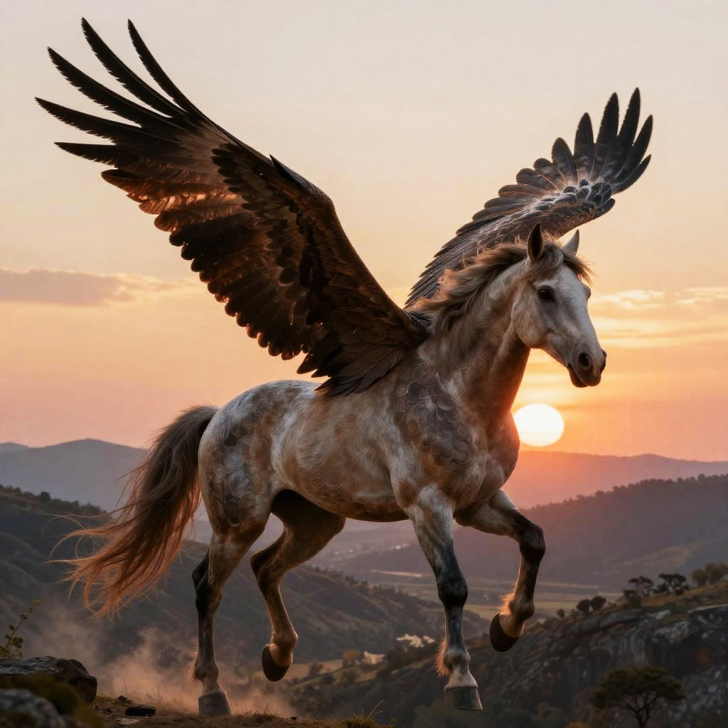 Photograph of a majestic, dappled grey Pegasus with large, black wings, mid-leap against a stunning sunset. The Pegasus's wings are fully extended, showcasing detailed feather textures. The sun is low in the orange and pink sky, casting a warm glow over rolling hills and sparse trees in the background. The Pegasus's mane and tail are windswept, adding a sense of motion. The image captures a magical, ethereal moment, with the Pegasus appearing powerful and graceful. The background features a distant, hilly landscape bathed in the soft light of the setting sun.