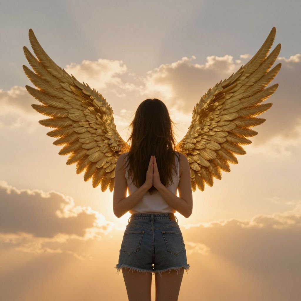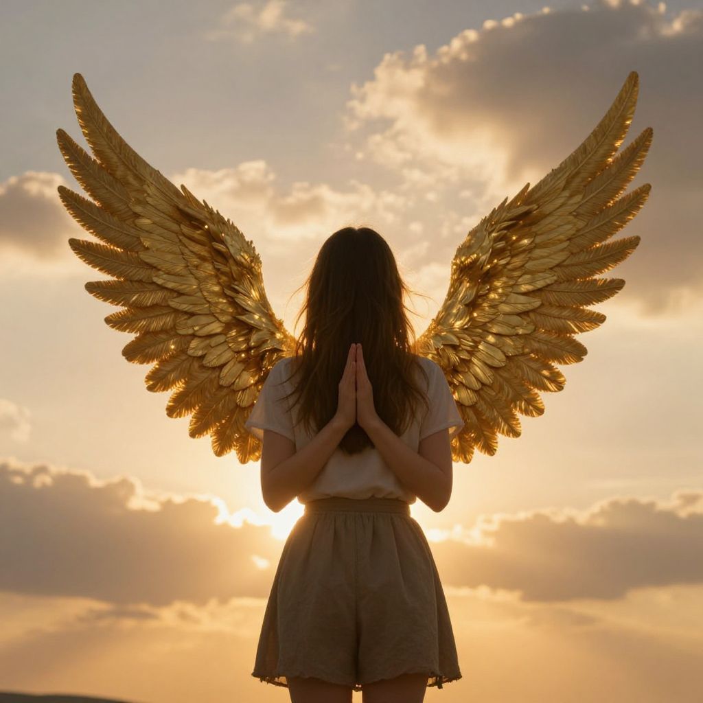 A young woman stands with her back turned, her hands clasped in prayer, as golden wings spread majestically behind her against a dramatic sky illuminated by a radiant sunset.