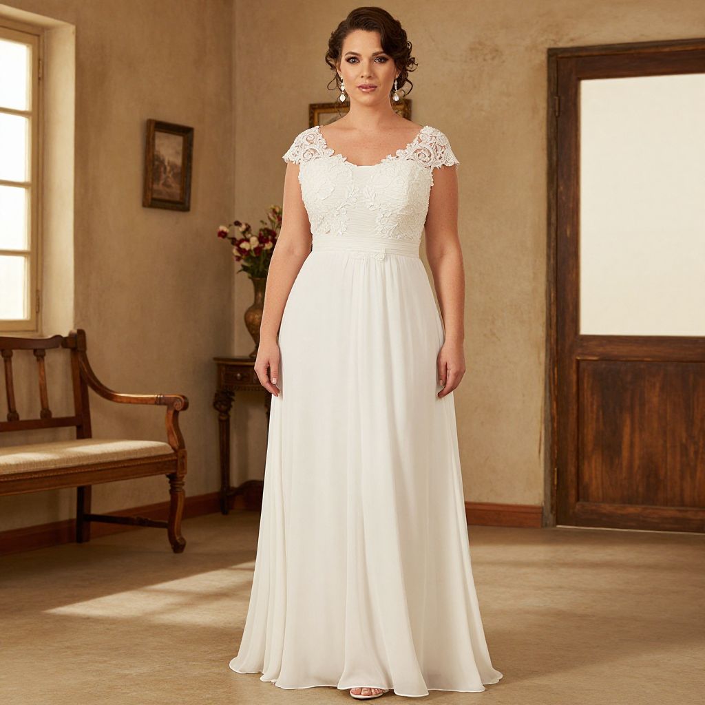 A high-definition, vintage-inspired photograph captures a woman in a stunning chiffon plus-size mother-of-the-bride dress featuring cap sleeves and intricate lace appliqués, exuding elegance against the backdrop of a rustic, golden-hour-lit interior.