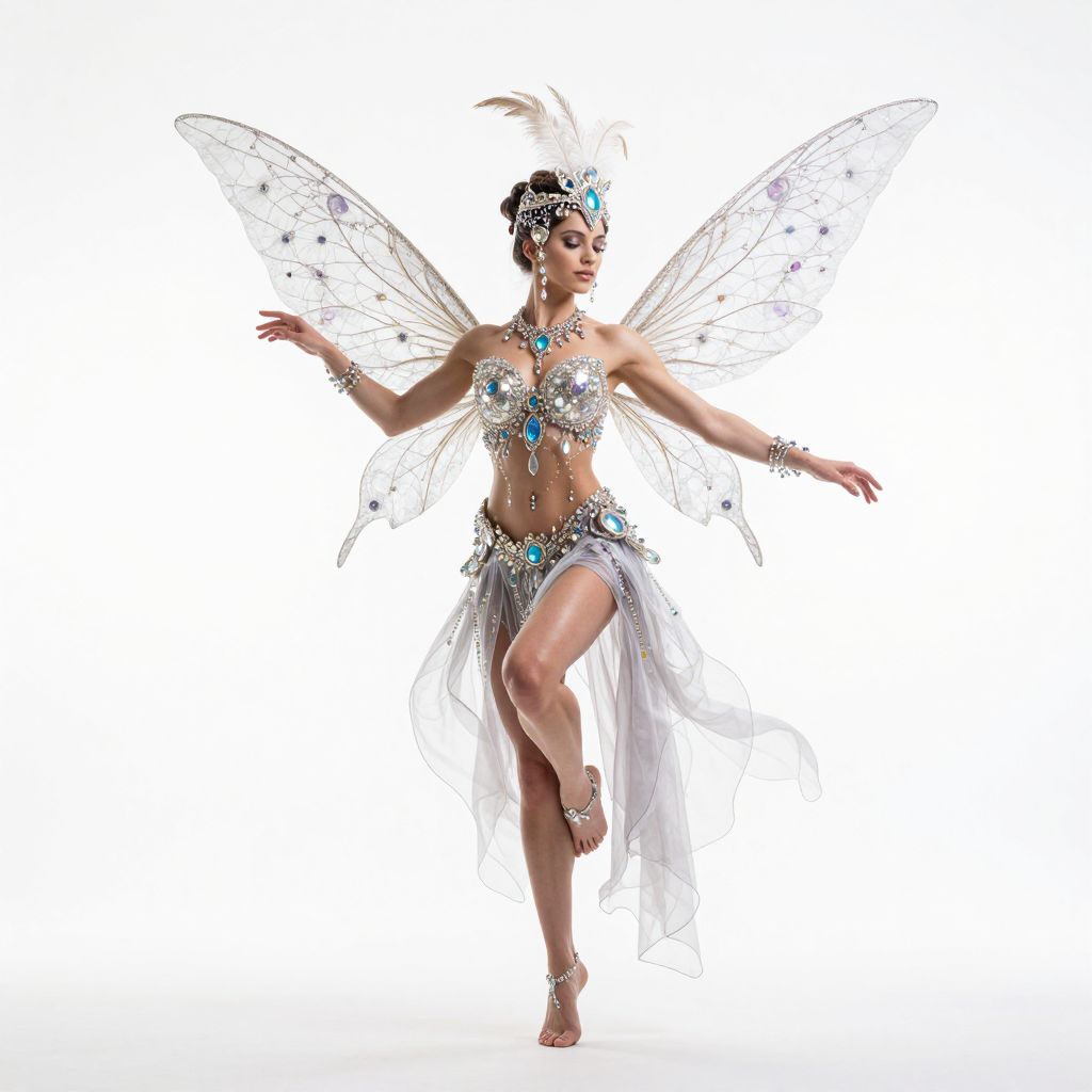 Photograph of a fairy dancer in a sparkling silver bikini, adorned with jewels, and translucent wings with peacock feathers, dancing gracefully against a white background