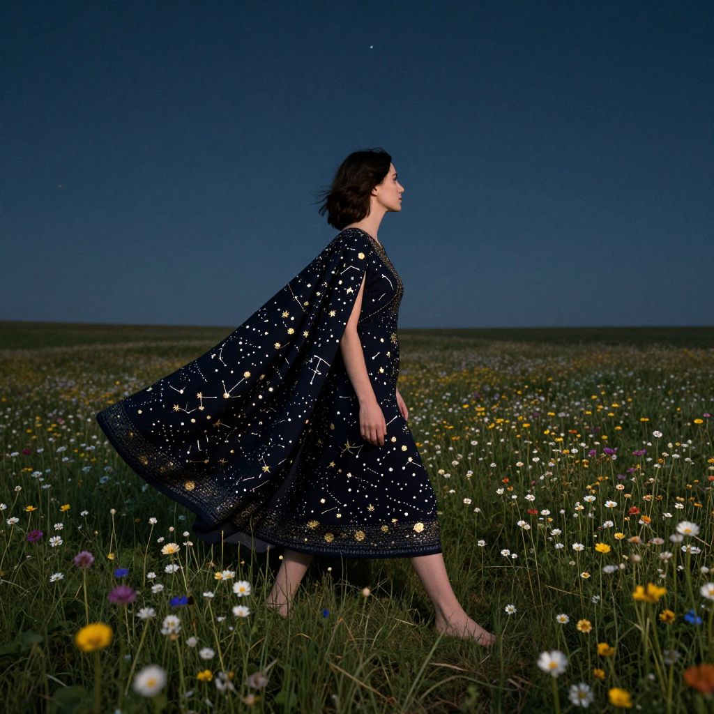 Barefoot, a woman draped in a flowing cloak adorned with golden constellations gracefully strides through a vibrant meadow of wildflowers, her silhouette cast against the starlit sky as she gazes toward the horizon.