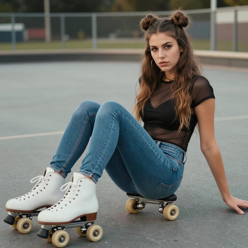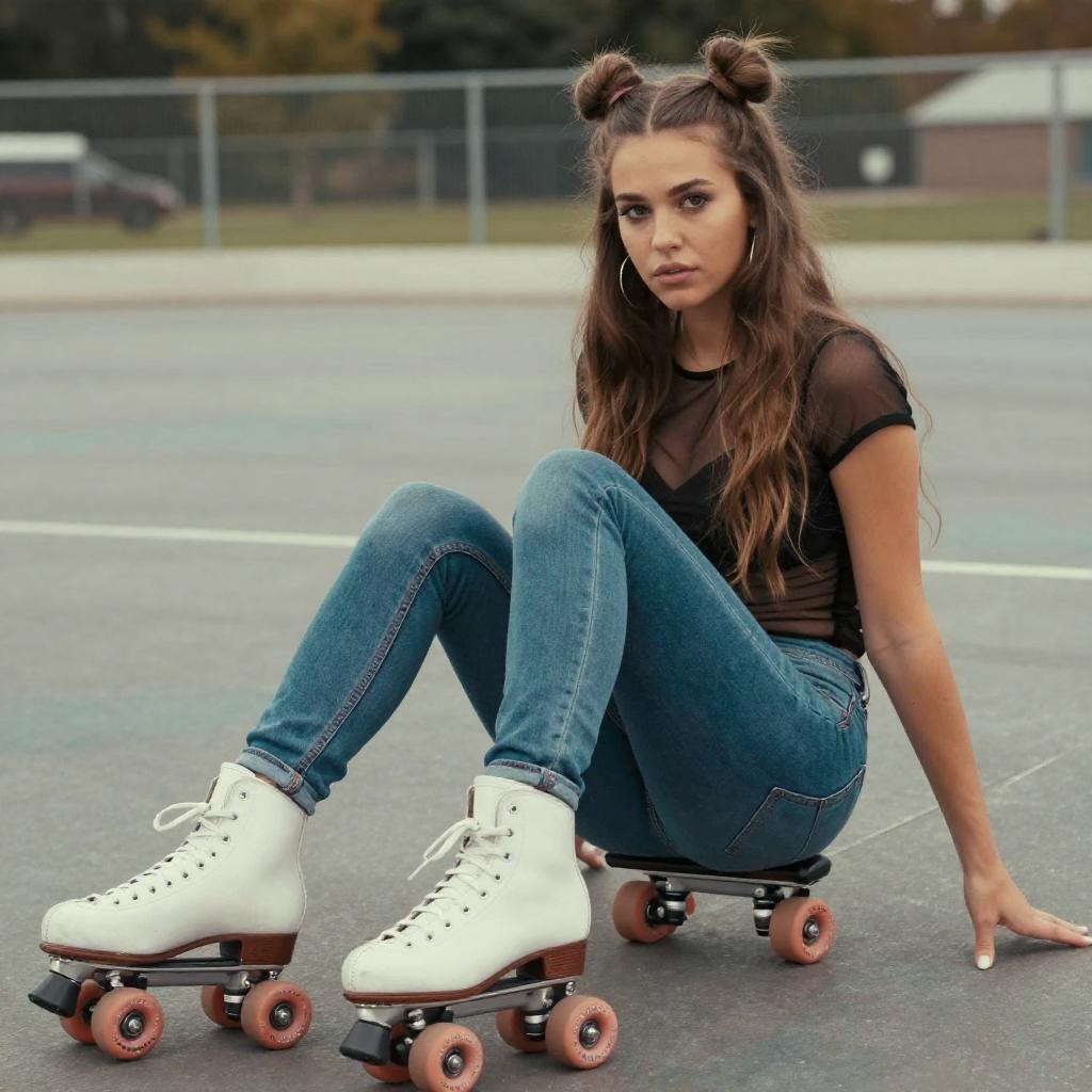 Photograph of a young woman with long, brown hair styled in two buns, sitting on an outdoor roller skating rink. She's wearing tight, blue jeans, a sheer black top, and white roller skates. Her legs are crossed, and she's leaning slightly forward, with a confident, intense expression. The background shows a blurred, fenced-in area with a blue-gray surface. The image has a slightly over-saturated, vintage filter.