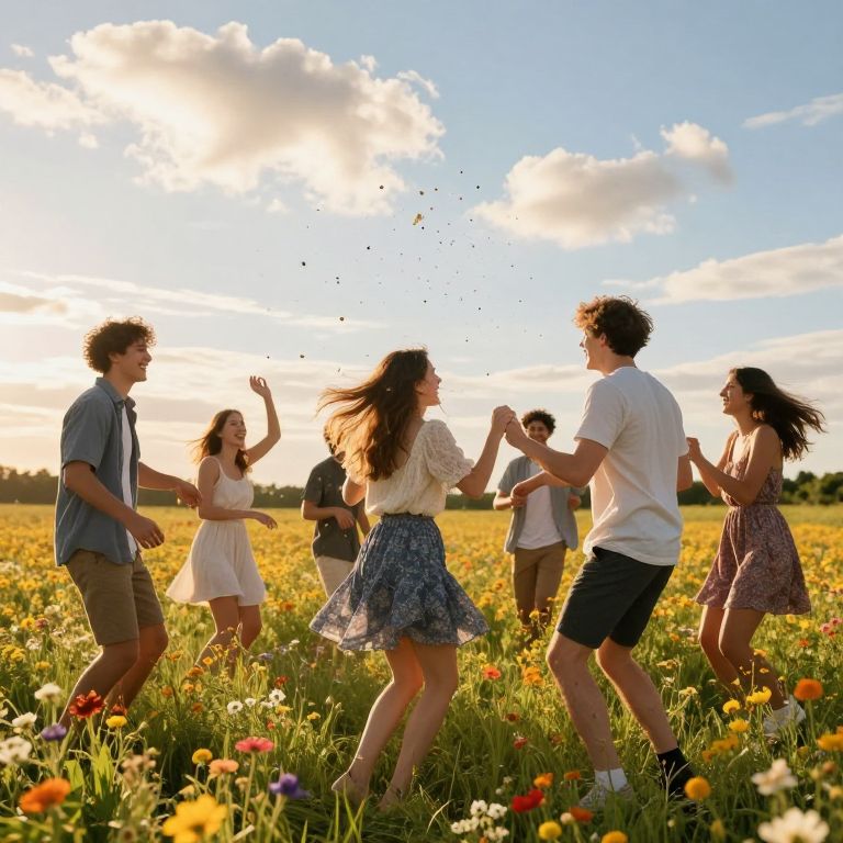 Joyous celebration in a vibrant meadow, golden sunlight filtering through blooming wildflowers, people dancing and laughing joyfully, colorful confetti floating in the gentle breeze, a picturesque blue sky with soft clouds, conveying pure happiness and warmth.