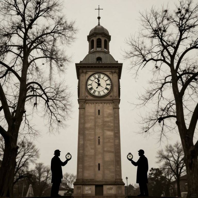 An ancient clock tower stands solemnly, its facade flanked by skeletal trees whose gnarled branches stretch like fractal shadows, while two silhouetted figures hold miniature clocks, each frozen in a different moment of time, defying the linear flow of existence.