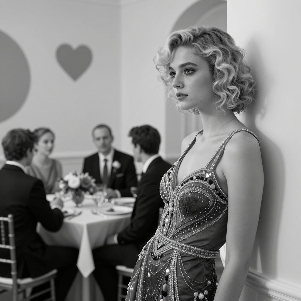 Black and white photograph of a young woman with short, curly blonde hair wearing a dark, sequined dress with silver embellishments, leaning against a wall. In the background, four people sit at a table with a floral centerpiece, three men in suits and one woman in a dress. The wall has circular and heart-shaped patterns.