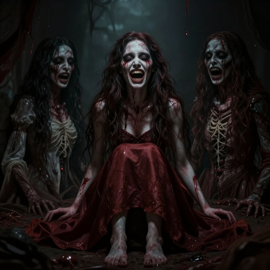 A dark, eerie digital artwork depicts three undead women with pale, decaying skin and long, disheveled hair. The central figure, seated and screaming, wears a blood-stained red dress that contrasts with her white, ghostly face. Her bare feet are visible, and blood drips from her mouth and dress. Flanking her are two other undead women, also screaming, with skeletal chests and tattered clothing. The background is a foggy, dark forest, enhancing the horror atmosphere. The image uses deep blues and reds, with high contrast, highlighting the macabre, haunting scene.
