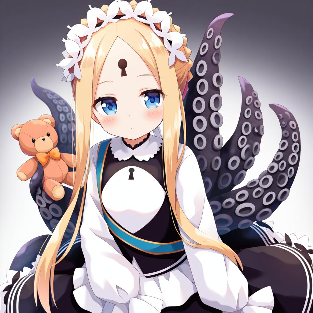 Digital illustration of Abigail Williams in a black and white maid-inspired outfit from Fate/Grand Order. The anime-style character has long blonde hair adorned with a white floral headdress and blue eyes. She features a distinctive keyhole design on her forehead and chest. Behind her, large purple tentacles emerge, and she holds a small teddy bear. The art style is vibrant and detailed, capturing the fantasy theme of the character.
