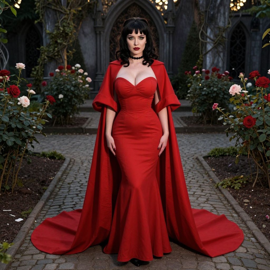 Photograph of a curvy woman with pale skin and dark, wavy hair wearing a form-fitting, red gown with a deep V-neck and a dramatic, flowing cape. She stands on a cobblestone path in a dark, gothic garden with rose bushes on either side. The background features a stone archway adorned with vines. Her red lips and intense gaze match her striking outfit. The image has a slightly dark, dramatic lighting, enhancing the gothic, romantic ambiance.